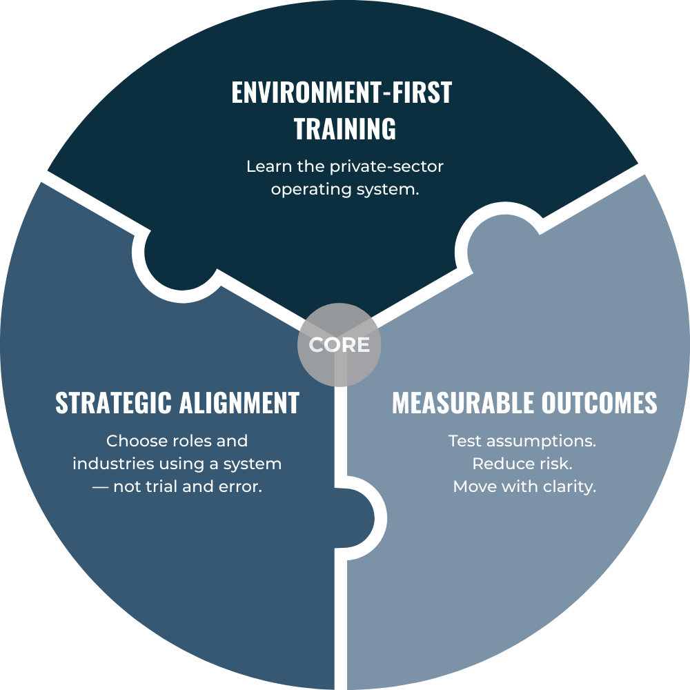 Once you understand the system behind the private sector, your transition becomes something you direct — not something that happens to you.